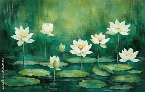 A beautiful lotus pond with green leaves and white flowers floating on the water, creating an ethereal scene of tranquility and beauty