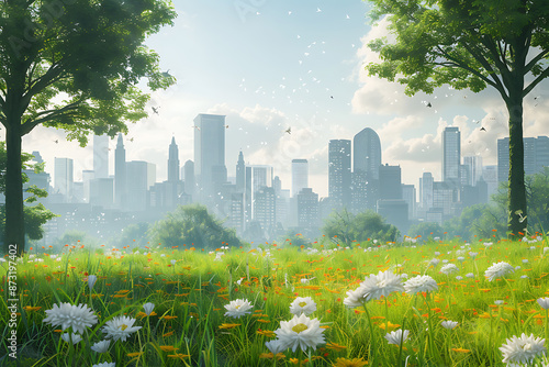 A beautiful meadow with lush greenery and flowers, with a city skyline of skyscrapers in the background, blending nature and urban life.