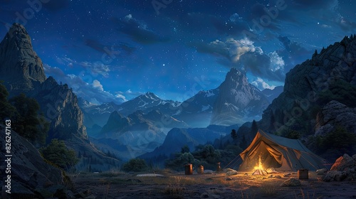 A beautiful mountain landscape with a small tent and a fire. The sky is dark and cloudy, and the mountains are covered in snow. The scene is peaceful and serene