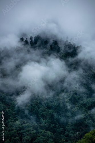 a beautiful mountain view with fog and clouds
