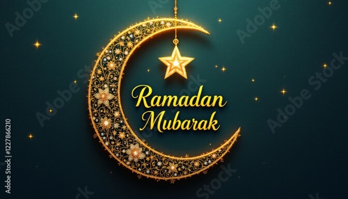 A beautiful, ornate gold crescent moon and star graphic, decorated with intricate details and glittering embellishments, against a dark teal background with scattered golden stars