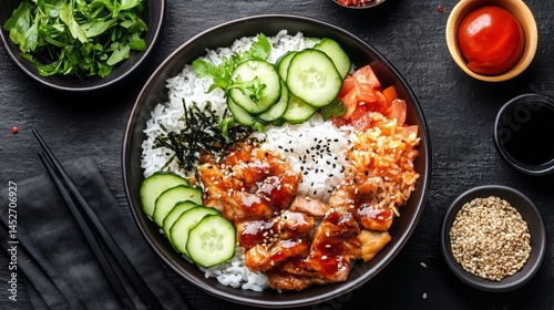 A beautiful overhead view of a bowl of fried rice with various toppings, including sliced cucumber and tomatoes, creating a colorful and inviting composition.