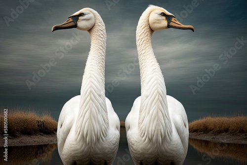 A beautiful picture of two Bewick Swans standing next to each other and looking in different directions with their long necks and faces. Generative AI