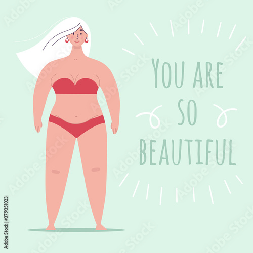 A beautiful plump woman in a swimsuit stands in full growth. Concept of body positivity, self-love, overweight. Flat vector female character