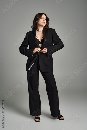 A beautiful plus-size woman in a black suit striking a pose while holding a sharp knife, exuding elegance and danger.