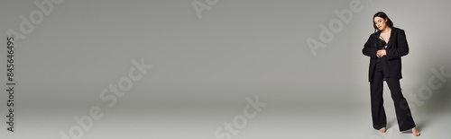 A beautiful plus-size woman strikes a pose in stylish attire against a gray backdrop.