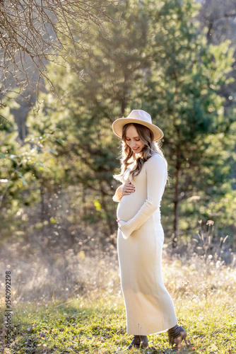 A beautiful pregnant woman is posing gracefully amidst a lush green setting, radiating immense joy and tranquility
