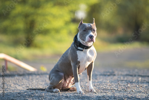 A beautiful purebred American Pit Bull Terrier plays in a spring field.