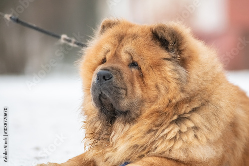 A beautiful purebred chow chow on a walk in the snow in winter.