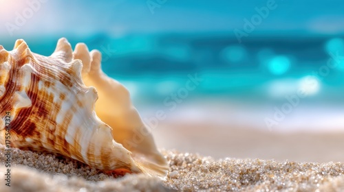 A beautiful seashell lies on soft sand, capturing the vibrant colors of the ocean. Gentle waves lap the shore under a bright sky, creating a peaceful beach scene perfect for relaxation