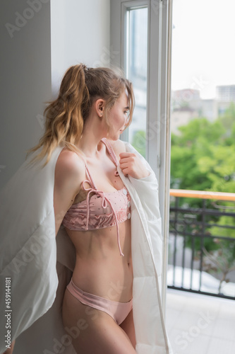 A beautiful, sexy, young girl in pink underwear, wrapped in a blanket near the balcony, looks out the window. Interior in white tones