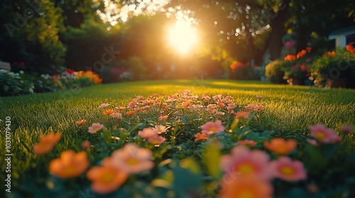 A beautiful shot of a lush, green lawn with pink flowers blooming in the foreground. The sun is setting in the background, creating a warm and inviting atmosphere.