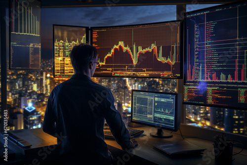 a beautiful skyline view at night from retro futuristic home office with computer screen, working location, man observing graphics market,economy ,business