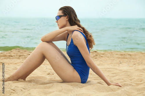 a beautiful, slender tanned woman with curly hair is sitting on the beach on the sand in sunny weather, sunbathing and enjoying her vacation with sunglasses on her face