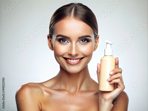 A beautiful smiling female model with perfect skin and hairstyle holds a sleek bottle of skincare cosmetic product against a clean white background.