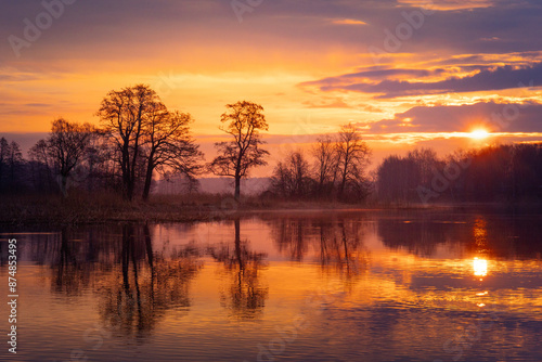 A beautiful spring sunrise at the river. Natural outdoors scenery in Riga, Latvia, Northern Europe.