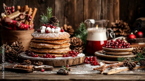 A beautiful stack of pancakes garnished with berries and festive decorations.