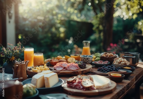 A Beautiful Summertime Outdoor Brunch Spread with Fresh Fruits, Cheeses, Jams, and Refreshing Juices set Against a Lush Green Garden Background