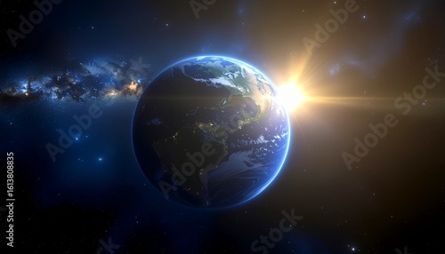 A beautiful sunrise over planet Earth as seen from deep space, with city lights and the Milky Way galaxy visible in the background.