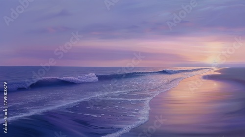 A beautiful sunset over the ocean. The water is a deep purple and the sky is a light purple. The sun is setting on the horizon and the waves are crashing on the shore.