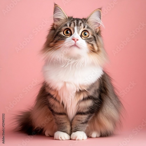 A beautiful tabby cat with white fur and expressive golden eyes sitting against a soft pink background, embodying elegance and charm