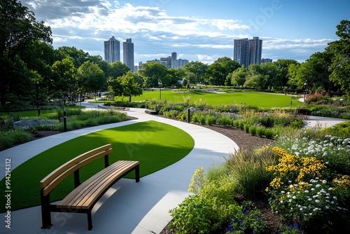 A beautiful urban park with greenery, walkways, and a bench, surrounded by city buildings under a bright sky.