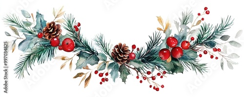 A beautiful watercolor illustration of a Christmas garland featuring pinecones, red berries, and greenery, perfect for festive decor.