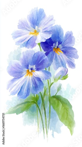 A beautiful watercolor illustration of blue pansies, emphasizing their delicate petals and vibrant colors, This image can be used for floral designs, invitations, or spring-themed projects,