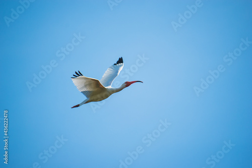 A beautiful White Ibis flies above at a nature preserve in Florida.