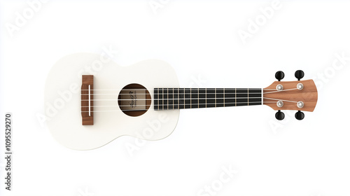 A beautiful white ukulele with wood details and four strings, isolated on a plain white background to highlight its shape and design.
