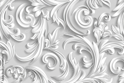 A beautiful white wallpaper featuring intricate swirly designs, scrolls, and leaves