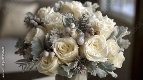 A beautiful winter bouquet of white roses, silver brunia, and dusty miller, holiday floral arrangement.