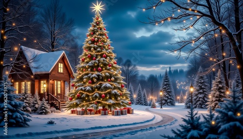 A Beautiful Winter Evening With a Decorated Christmas Tree Near a Cozy Cabin in the Woods