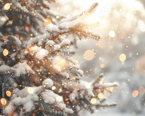 A beautiful winter scene with snow-covered trees and sparkling lights. AI.