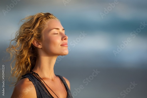 A beautiful woman enjoying the calm beach breeze with eyes closed and a serene expression