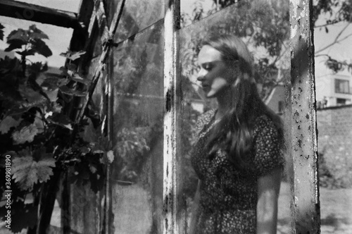 A beautiful woman inside old orangery