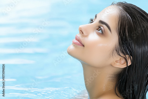 A beautiful woman with wet hair is looking up at the sky, standing in clear blue water. She has long black straight hair and fair skin.