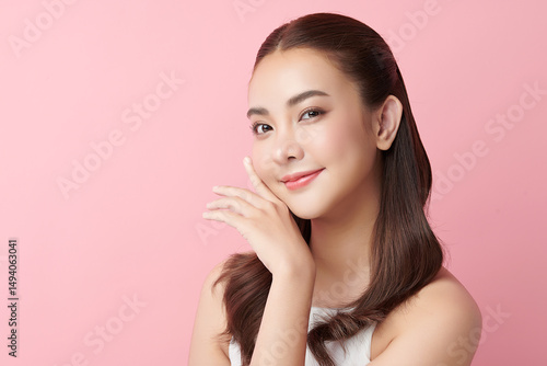 A beautiful young Asian woman with clean, fresh skin against a pink background. Skincare, facial treatment, cosmetology, beauty, and spa. An elegant portrait of an Asian woman.