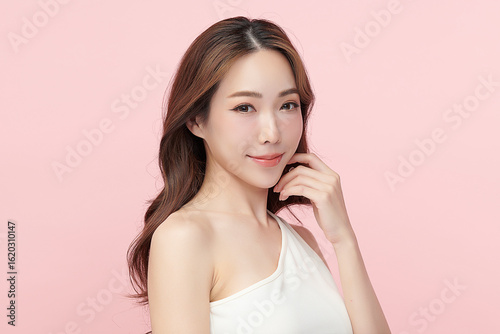 A beautiful young Asian woman with clean, fresh skin against a pink background. Skincare, facial treatment, cosmetology, beauty, and spa. An elegant portrait of an Asian woman.