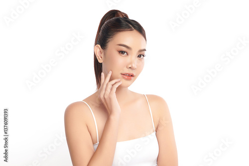 A beautiful young Asian woman with clean, fresh skin against a white background. Skincare, facial treatment, cosmetology, beauty, and spa. An elegant portrait of an Asian woman.