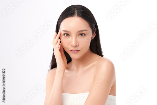 A beautiful young Asian woman with clean, fresh skin against a white background. Skincare, facial treatment, cosmetology, beauty, and spa. An elegant portrait of an Asian woman.