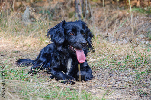A beautiful young black cocker spaniel lies on dry grass in a coniferous forest with his tongue out