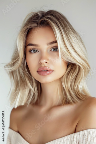 A beautiful young blonde with shoulder-length hair and light makeup posing on a white background. She has a fashionably styled bob hairstyle with modern textured hair coloring.