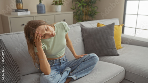A beautiful young blonde woman sitting in a living room of an apartment appears thoughtful and relaxed, wearing casual jeans and a green top, surrounded by cozy home decor.