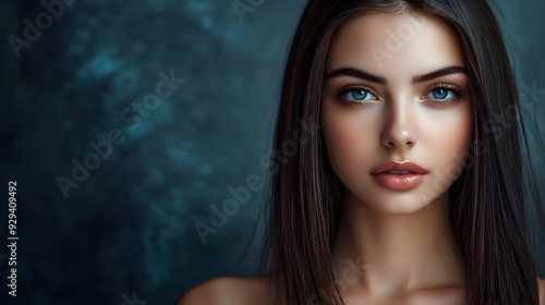 A beautiful young female model on a dark background with perfect skin, portrait of a girl of model appearance with straight hair