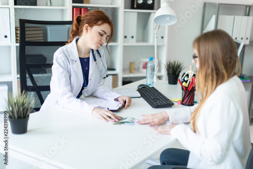 A beautiful young girl in a white robe is sitting at the desk in the office and communicating with the interlocutor. The interlocutor gives the girl money.