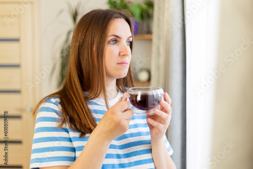 A beautiful young woman drinking tea near the window of the house
