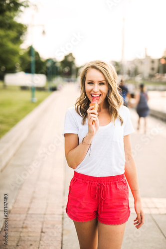 A beautiful, young woman enjoying ice cream by the marina