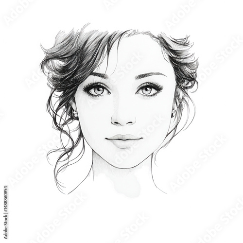 A beautiful young woman's face is portrayed in a detailed pencil sketch art.