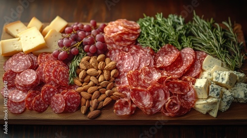A beautifully arranged charcuterie board featuring meats, cheeses, nuts, and grapes.